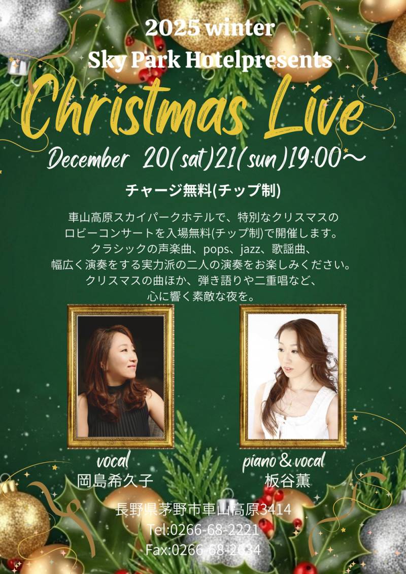2025年12月20日(土)・21日(日)19:00より、ホテルロビーにて「クリスマスロビーコンサート」を開催いたします。チャージ無料(チップ制)で、どなたでもご自由にご参加いただけます。